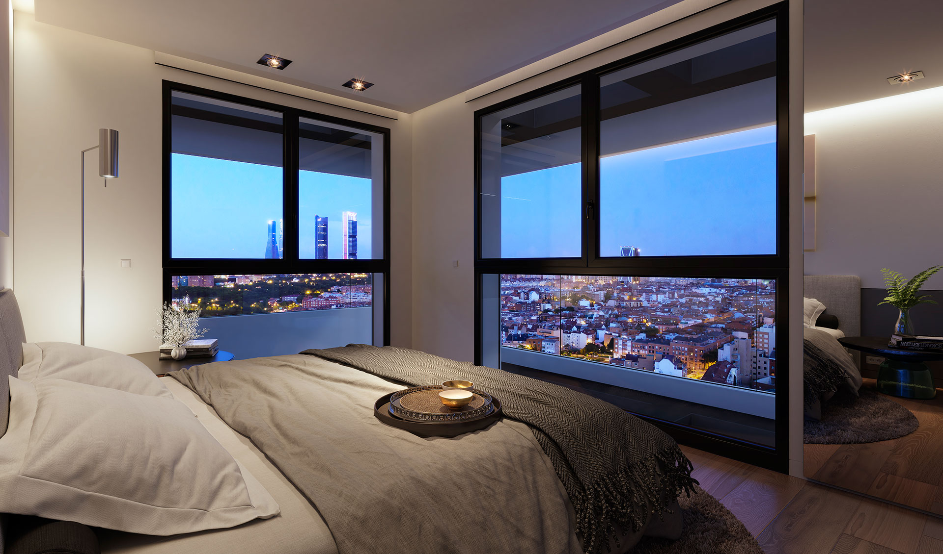 The wraparound terraces, with glass railings, become a natural extension of the living area, offering a sense of openness and connection to Madrid’s skyline.